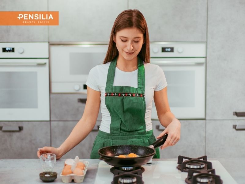 Lời khuyên: Bạn hãy giữ khoảng cách an toàn với nguồn nhiệt. Ngoài ra, hãy dùng xịt khoáng để hạ nhiệt da tức thì sau khi đứng bếp.