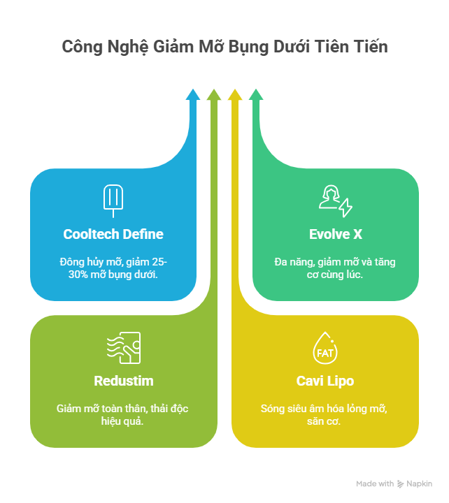 Công nghệ hiện đại như Cooltech Define, Evolve X, Redustim hay Cavi Lipo giúp loại bỏ mỡ thừa an toàn, đồng thời siết cơ và làm săn da hiệu quả.
