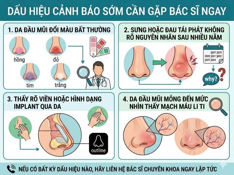 Da mỏng và lộ implant là hậu quả thường gặp đầu tiên. Da vùng đầu mũi bắt đầu đổi màu nhẹ – hồng hoặc xanh tím. Viền silicon hiện rõ dưới lớp da ngày càng mỏng. Nguyên nhân là sự kết hợp giữa lão hóa da tự nhiên và áp lực liên tục của implant.