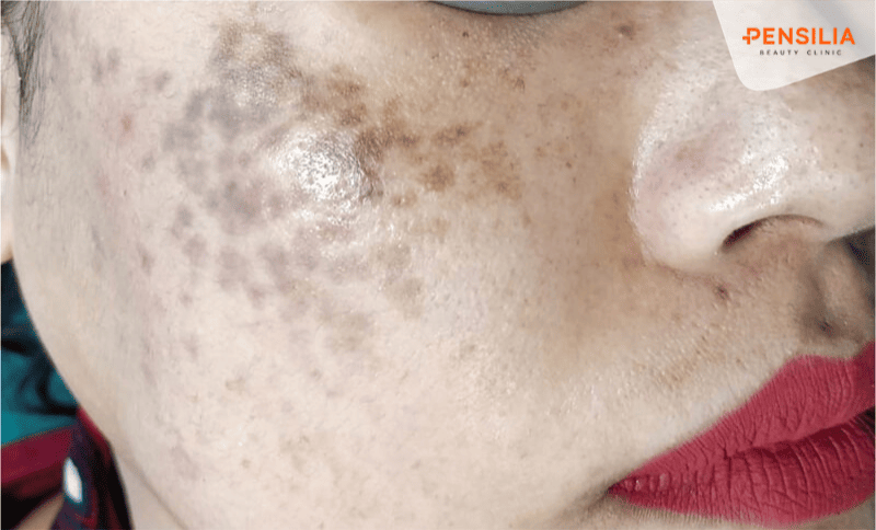 Thường tập trung thành các nốt tròn trên bề mặt da có chân ăn sâu trong lớp cấu trúc da. Chủ yếu là màng đáy lớp thượng bì, đôi khi sâu xuống lớp trung bì. Kích thước các đốm nám thường không đều, to nhỏ đan xen nhau.