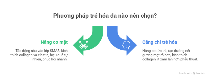 Nâng cơ trẻ hóa và căng chỉ đều là phương pháp an toàn, hiệu quả và không phẫu thuật. Nâng cơ mặt tác động sâu vào lớp SMAS, giúp làm săn chắc và tăng sinh collagen lâu dài. Ngược lại, căng chỉ tạo khung nâng đỡ tức thì, tăng đàn hồi da và định hình đường nét khuôn mặt.