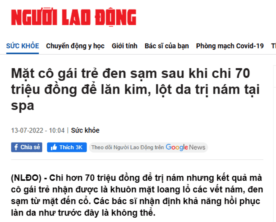 Báo chí đưa tin về các ca trị nám tại spa với hậu quả không mong muốn