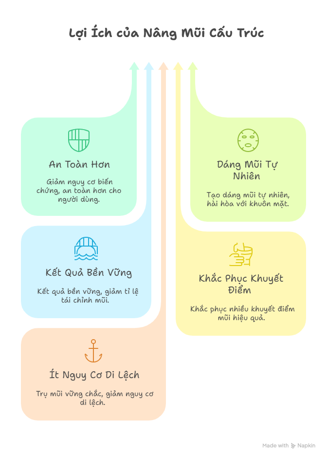 Khung vững chắc giúp mũi duy trì lâu dài. Nghiên cứu cho thấy nâng mũi cấu trúc giảm tỉ lệ tái chỉnh mũi so với nâng sống thông thường (Sykes, 2013).